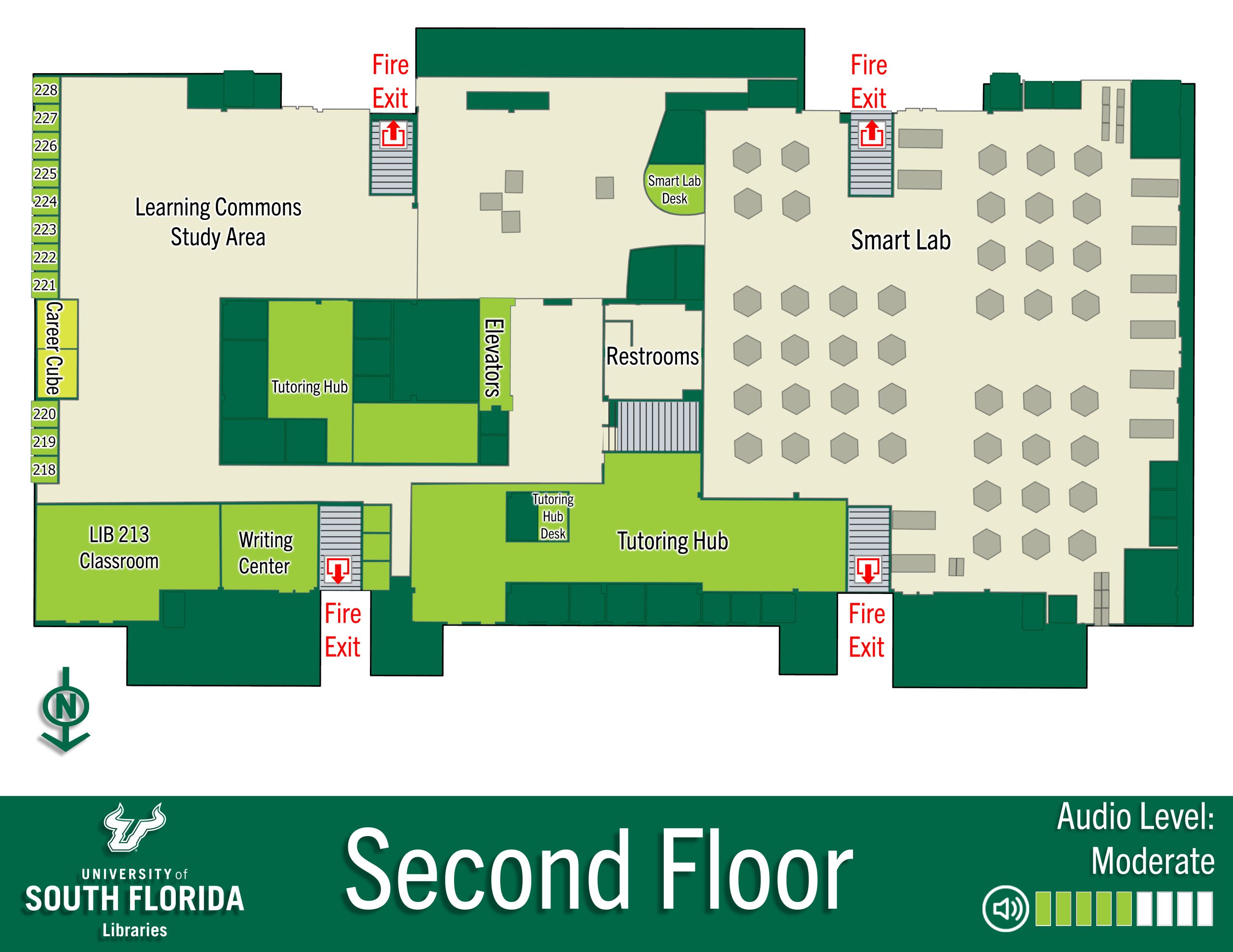 Library Services Desk (Circulation, Research help, Course Reserves, and Interlibrary Loan), Learning Commons study area, USF Card Shop, IT Help Desk, Printers, Computer Lab, Integrated Research & Impact Services (IRIS).