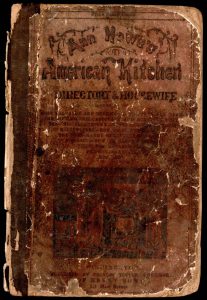 Reading Time: 7 minutesThe USF Libraries’ 1864 printing of American Kitchen, Directory and Housewife by Ann Howe is a later edition of a popular book first published as American Housewife in 1839. The recipe for “Composition Cake” as it is written in the clipping above requires “five cups of shifted flour, three of sugar, two of butter, a tea spoonful of soda, a tea cup of sweet milk, a wine-glass of wine, one of brandy, five eggs, one nutmeg; add a point of seeded raising if you want the cake quite rich.”